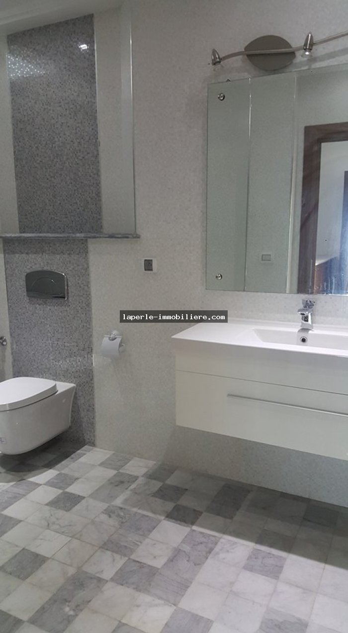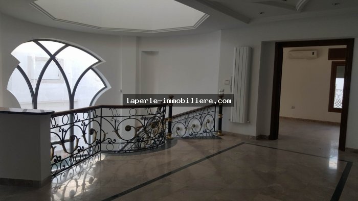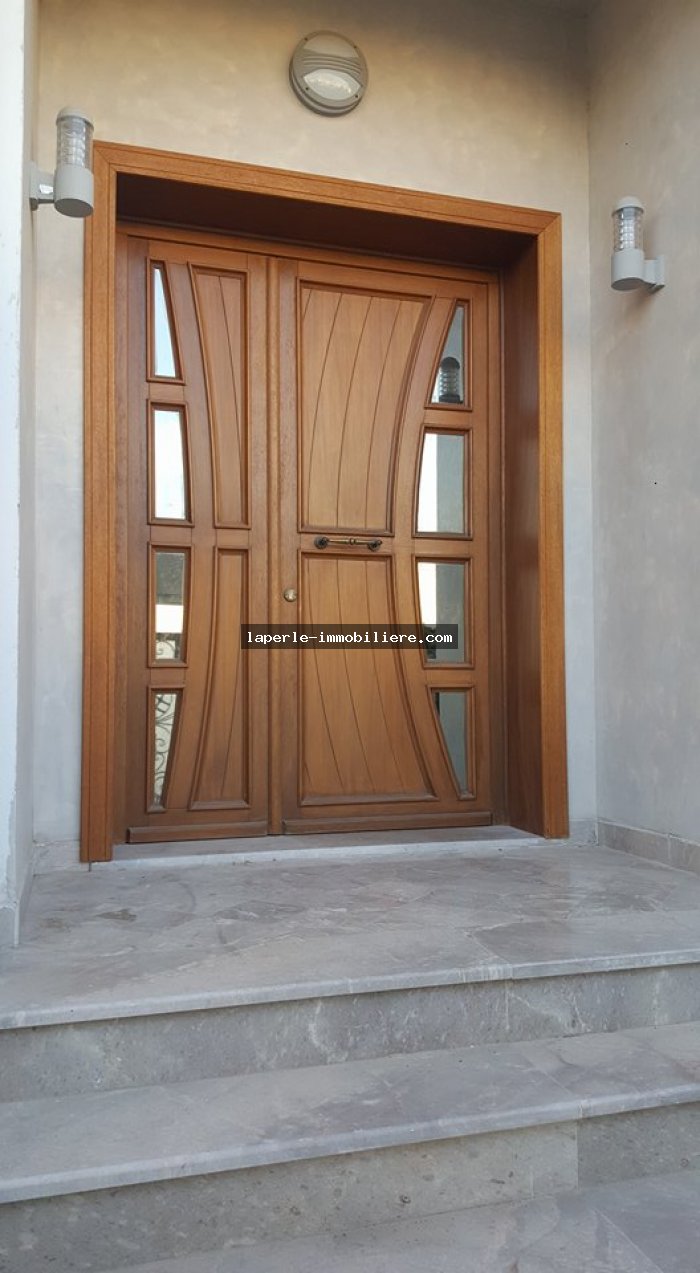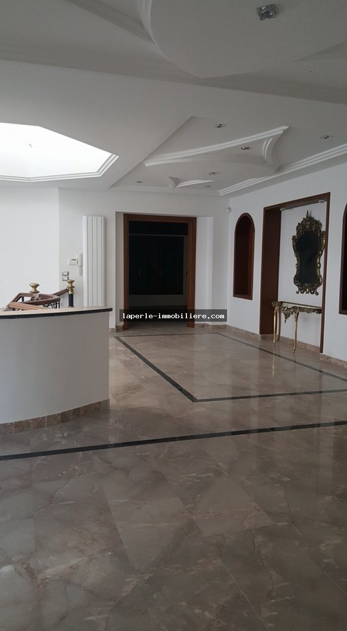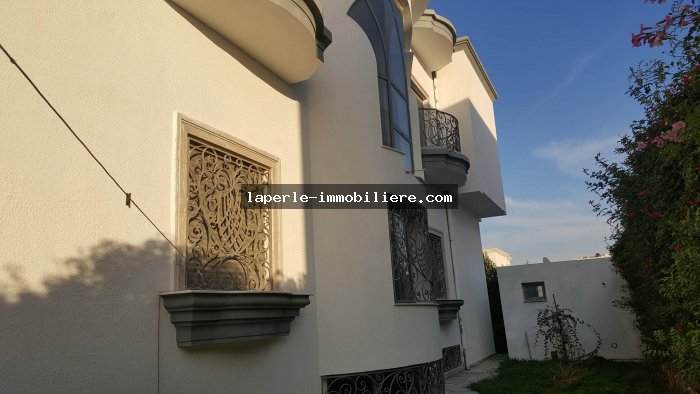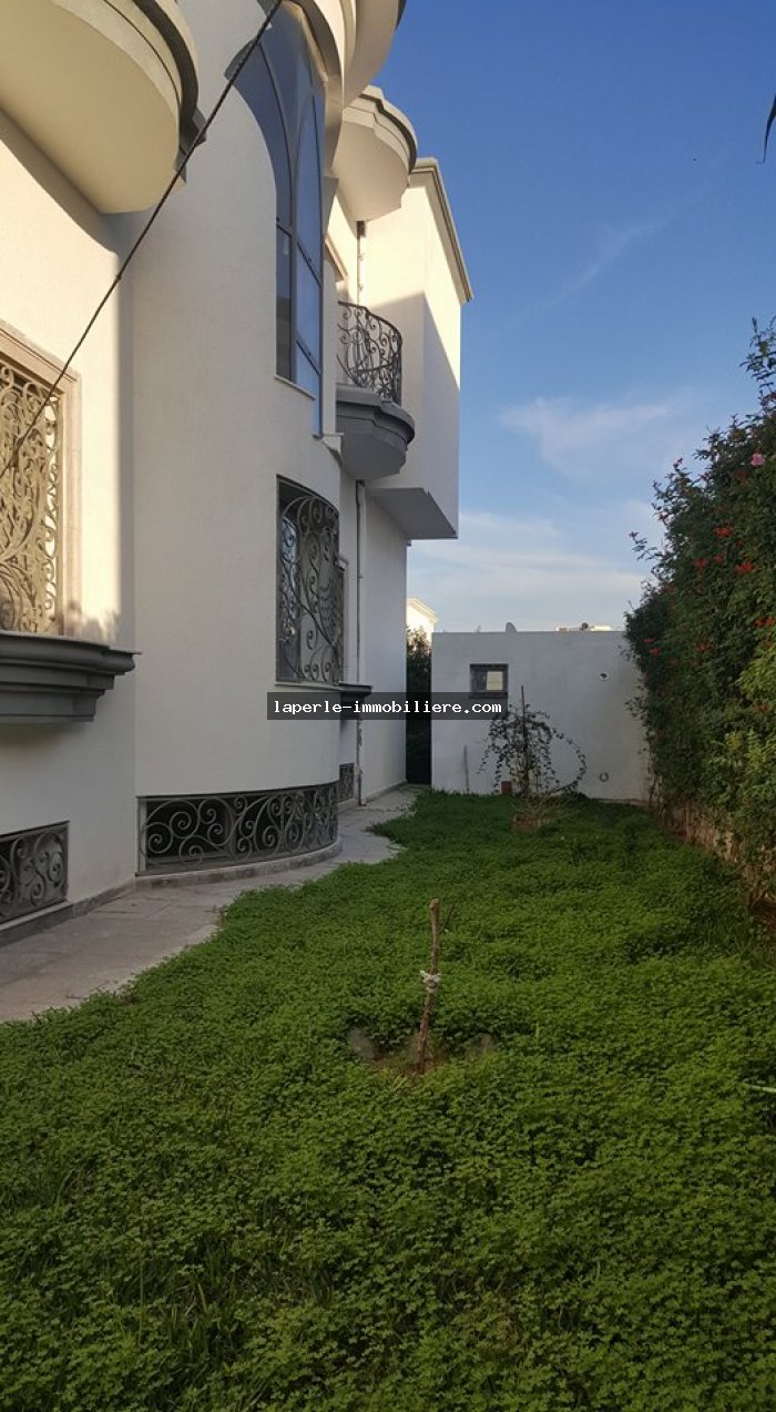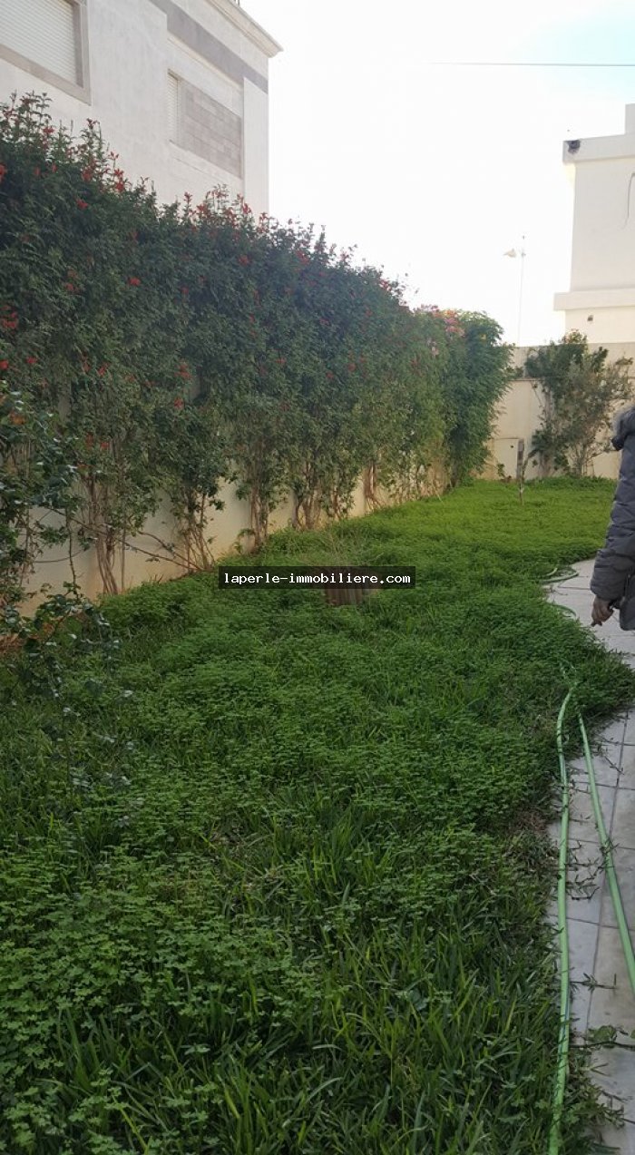 A louer annuellement chez notre agence la Perle Immobilière une somptueuse villa neuve son meuble dans un lotissement résidentiel, de haut standing, avec une belle architecture moderne, située dans un quartier calme et sécurisé,sise à Tunis- Marssa et à proximité des commerces, animations, restaurants, hôtels. La villa est entourée d’un jardin gazonné.