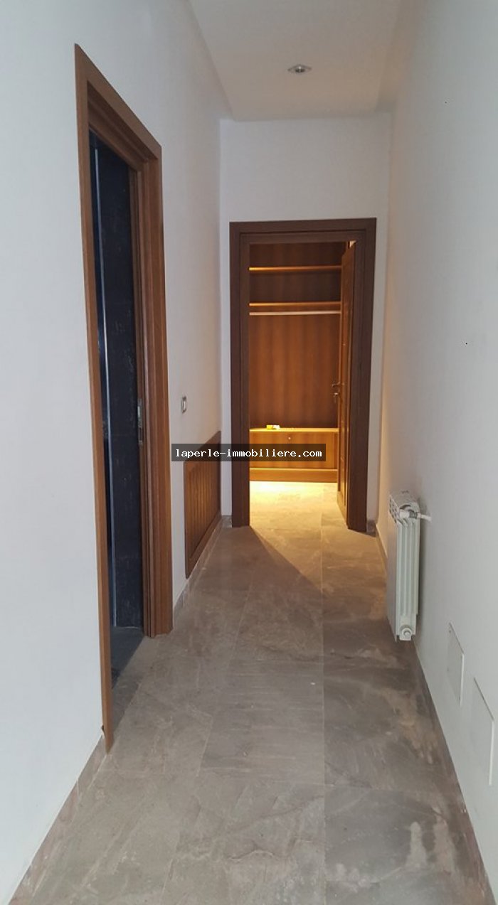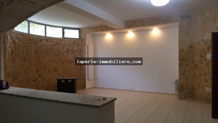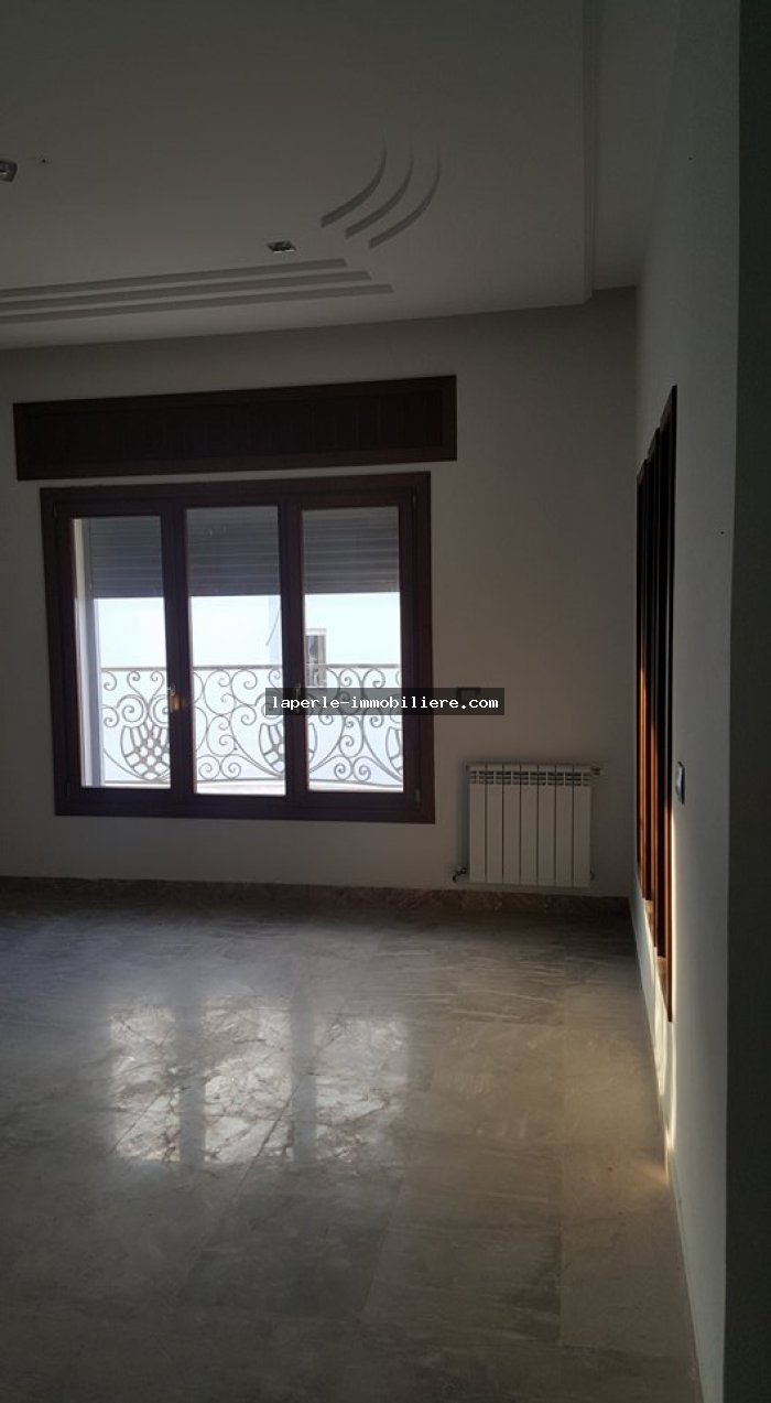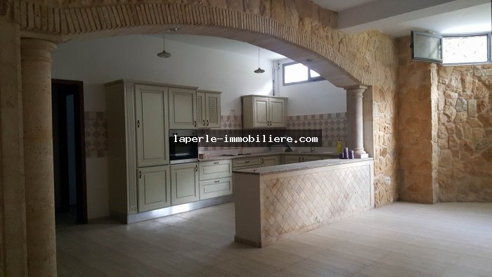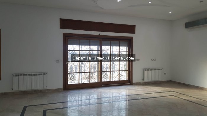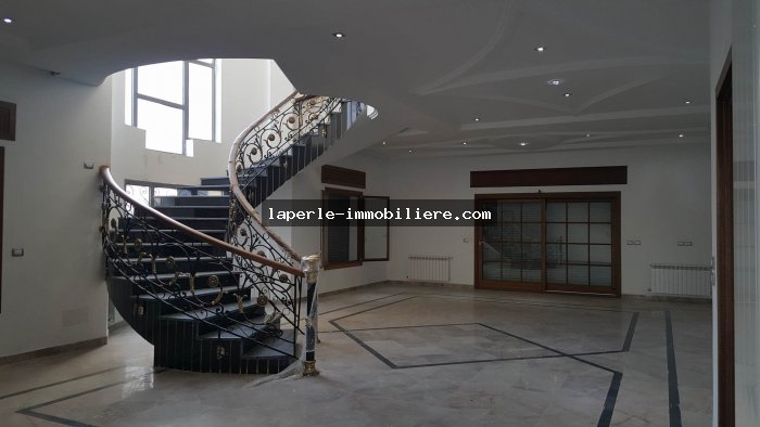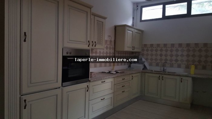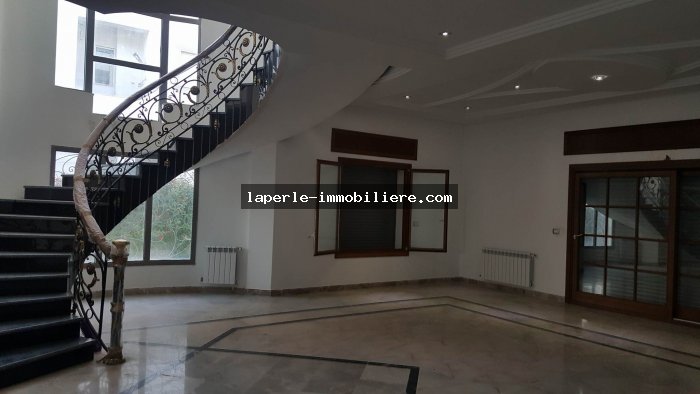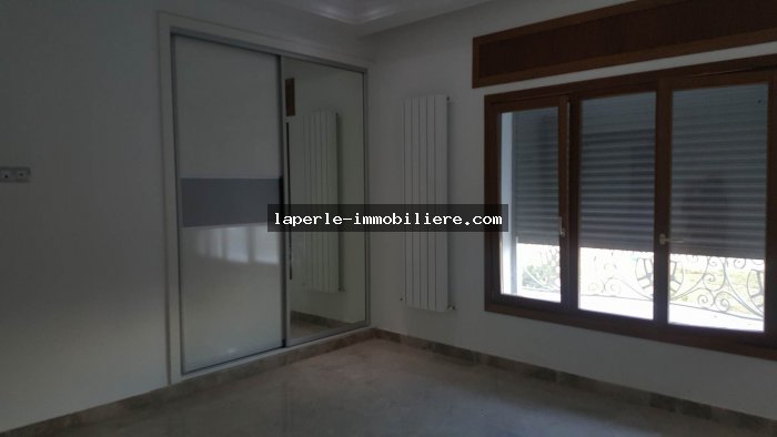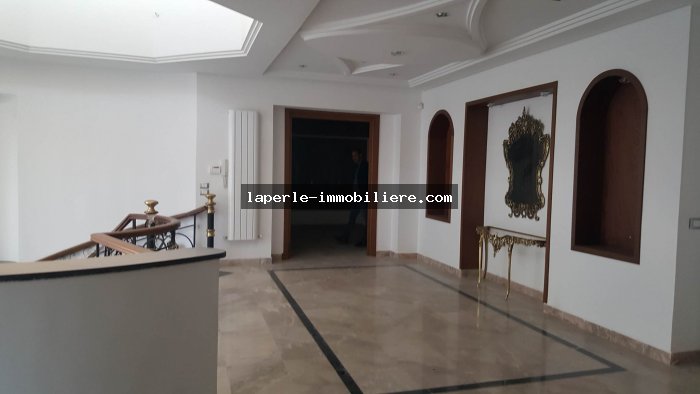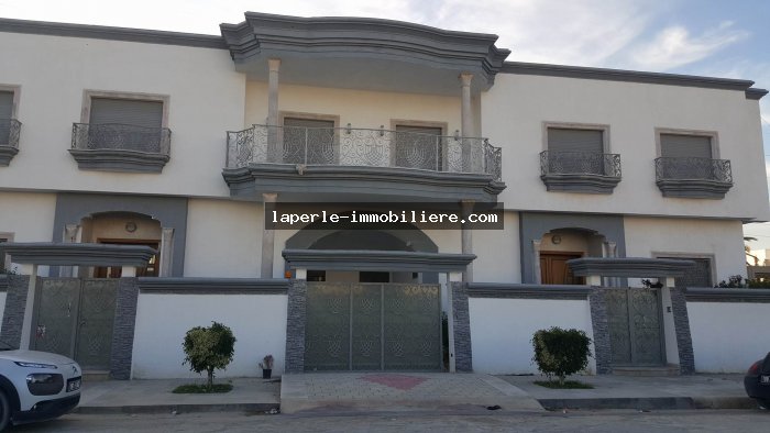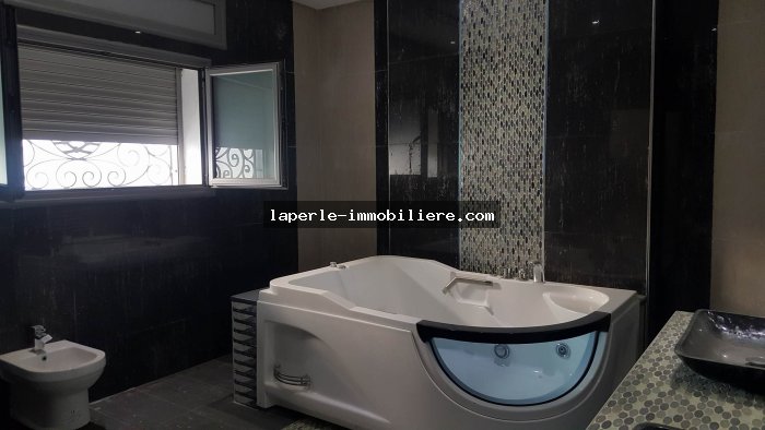 A louer annuellement chez notre agence la Perle Immobilière une somptueuse villa neuve son meuble dans un lotissement résidentiel, de haut standing, avec une belle architecture moderne, située dans un quartier calme et sécurisé,sise à Tunis- Marssa et à proximité des commerces, animations, restaurants, hôtels. La villa est entourée d’un jardin gazonné.