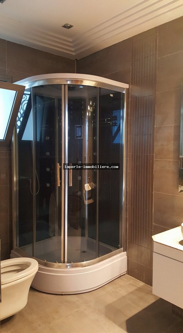 - Au RDC : Hall, un grand Salon salle à manger de superficie 125m² en double hauteur et une grande baie vitrée qui donne directement sur la terrasse,une chambre à coucher avec un coi de dressing, une salle de bain avec une Cabine de douche hydromassage et une grand cuisine moderne de surface 70m² qui donne à un vaste terrasse.