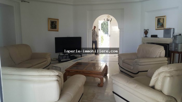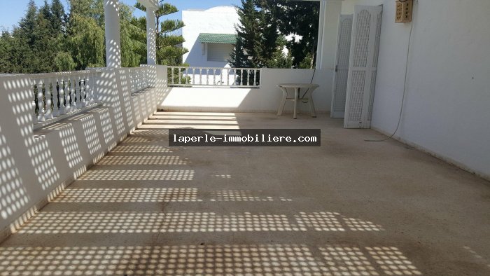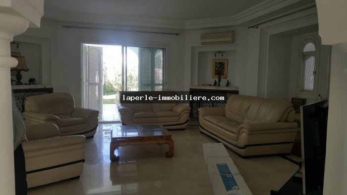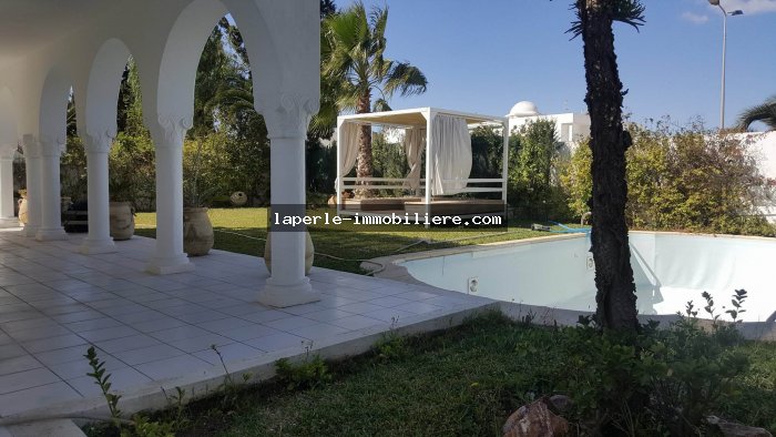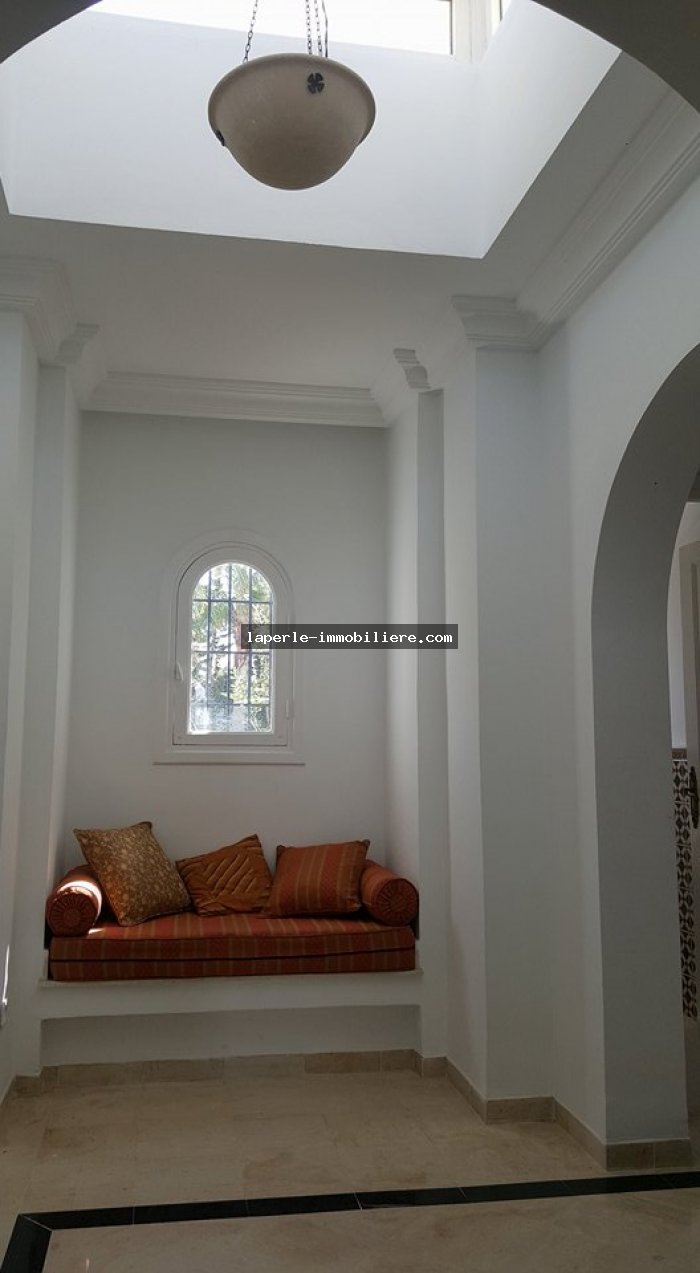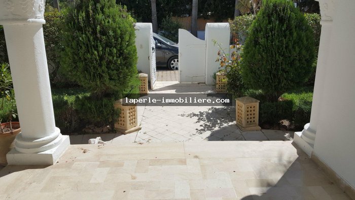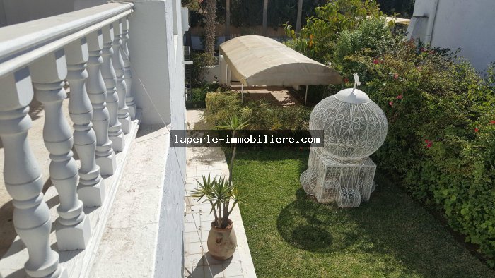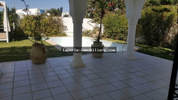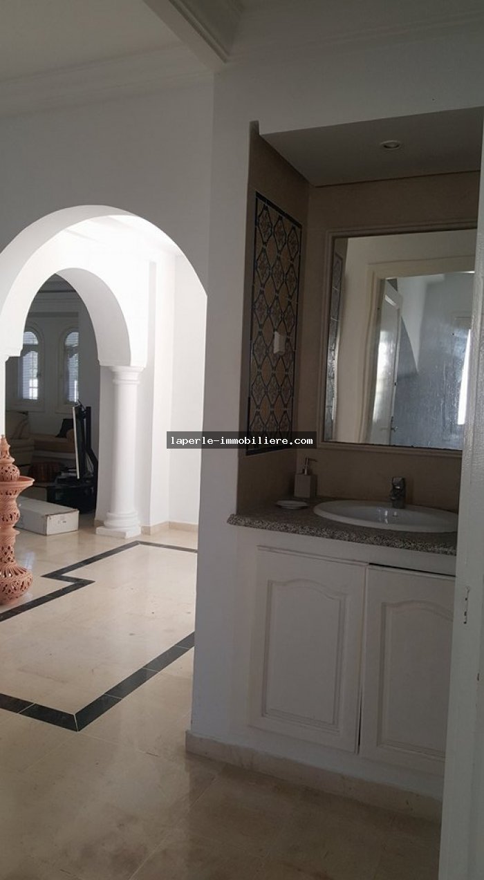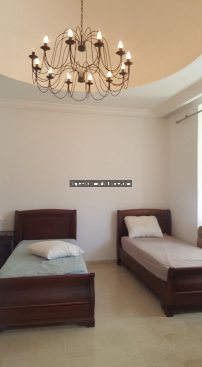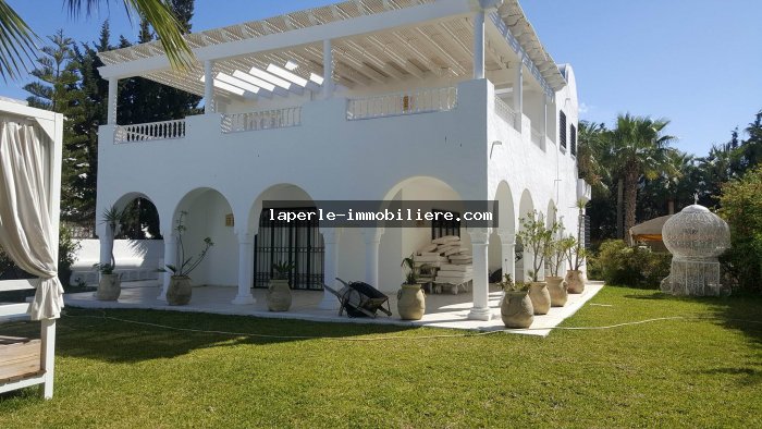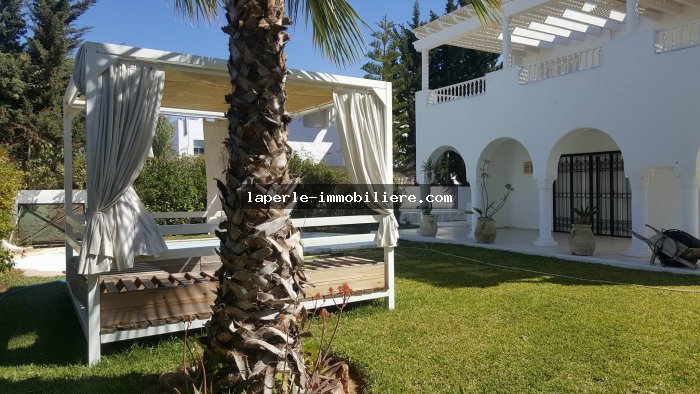 Villa sur 2 niveaux avec piscine et jardin gazonné dans un endroit calme notamment Jinen Hammamet ,la villa est d'architecture moderne se distribuant de la façon suivante: