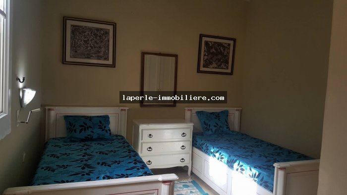 Profiter votre vacance Familiale inoubliable avec notre agence la perle,une belle S+2 avec un grand jardin dont un résidence privée.La appartement se compose d'un salon,suite parentale,chambre,salle d'eau,cuisine bien équiper,garage,piscine collective