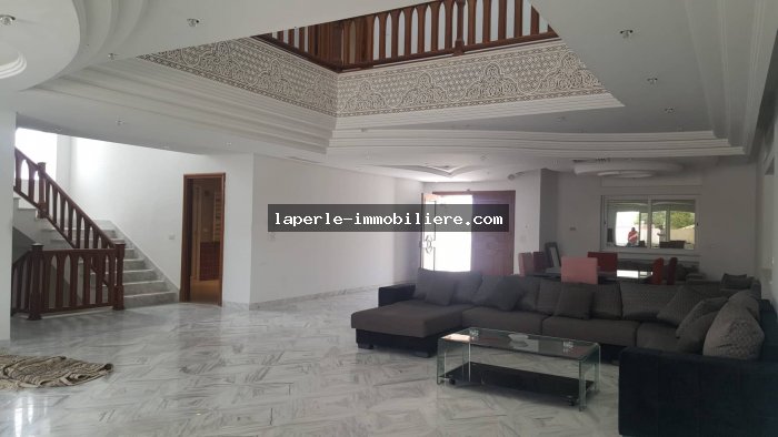 A l’étage, la villa compte une vaste hall, deux suites parentale, trois chambres à coucher,une salle marocaine une salle de Sauna et deux salle de bain.