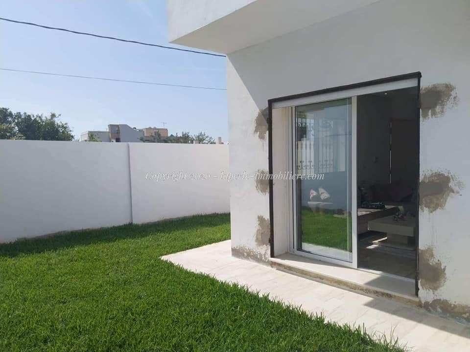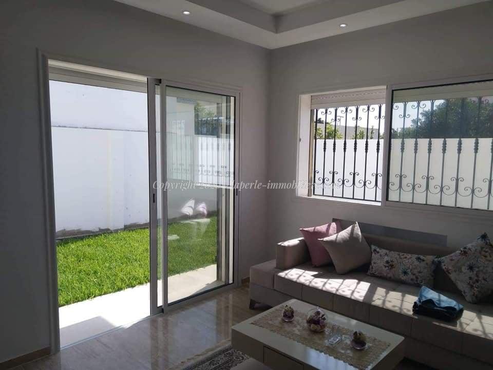 A vendre chez notre agence la Perle immobilière Hammamet villa avec jardin nouvellement construite à Hammamet pas loin de la plage hôtel omar khayem , elle fait 190 m² de terrain dont 150 m² couvert.
