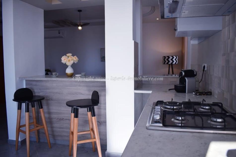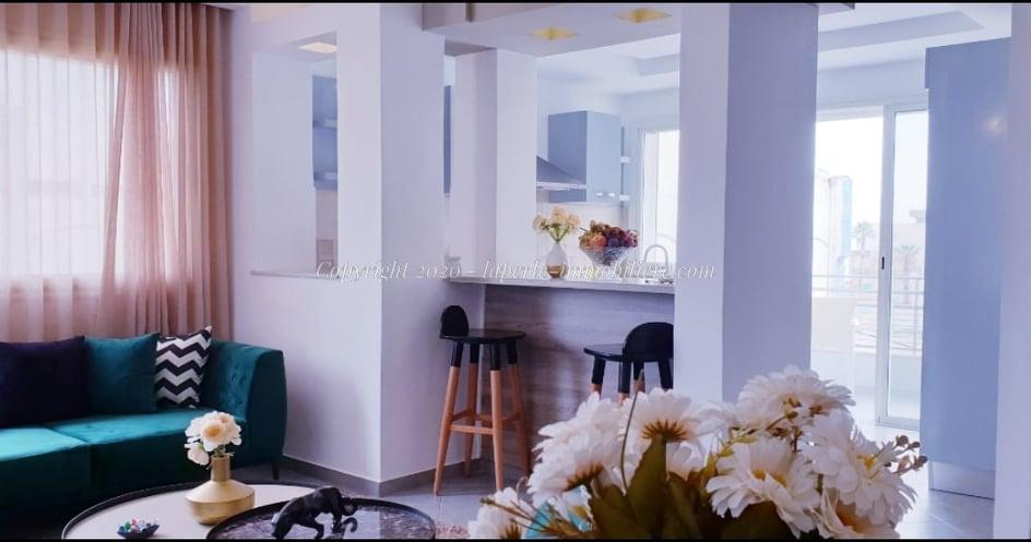 Profiter vous vacance familiale avec notre agence la perle immobilière Hammamet un Appartement haut standing au 3 éme étagé pieds dans l 'eau , S+2 chauffées et climatisées, salles de bain, cuisine équipée et aménagée .