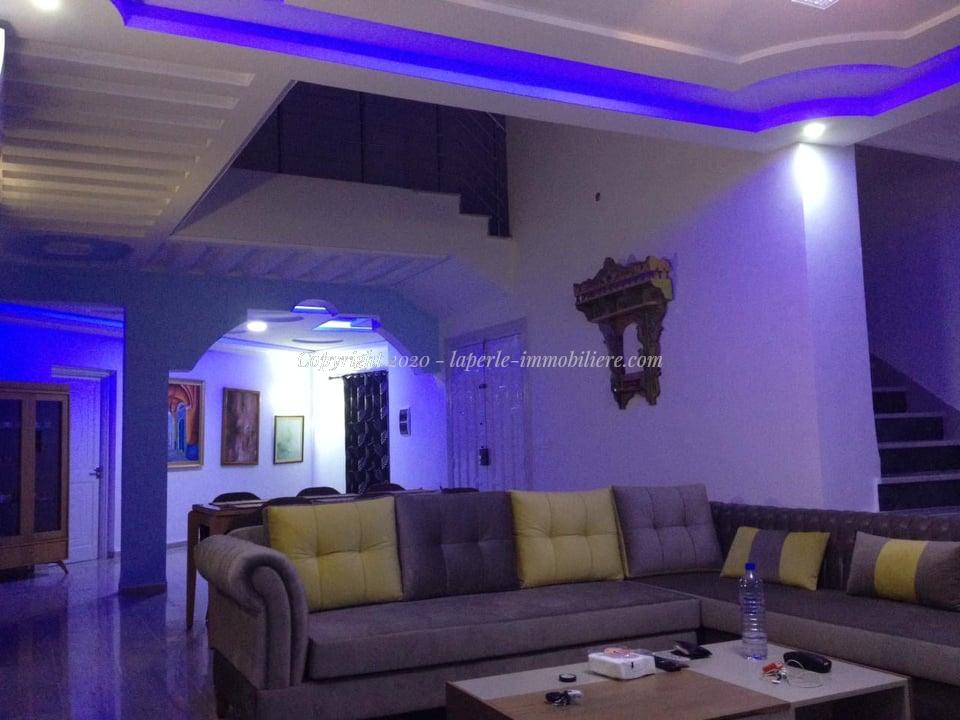 La villa est érigée sur deux niveaux, elle comporte au rez au chaussée, un grand salon, coin de salle à manger, une cuisine moderne bien équipée et une salle de bain, chambre de nuit avec tirasse