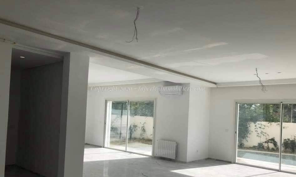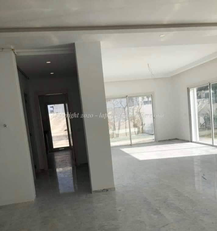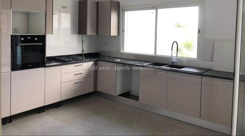 RDC : Cuisine équipée ( four, plaque, machine lave vaisselle), salle d’eau, un grand salon spacieuse et très bien lumineuse avec un jardin et piscine. On trouve en 2ème niveau 3 suites.