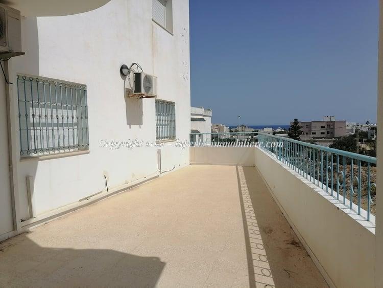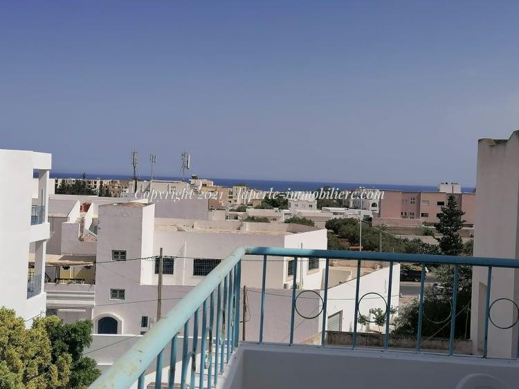 Appartement au 1 er étage à louer pour vos vacances saisonnière située dans une Résidence gardée et bien sécurisée à Hammamet Nord __ rond point sultane, de type S+2 chauffées et climatisées. On trouve un salon ,une cuisine bien agencée , 2 chambres à coucher et une grande terrasse avec vue de mer .