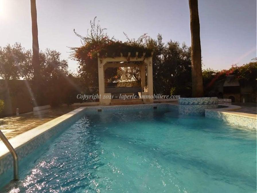 La Soukra Chotrana magnifique propriété de 3000 M² très grande piscine avec espace terrasse et un jardin superbement aménagé entretenu. Prix revu à 1 900 000 TND Un millions neuf cent mille dinars. Soit 575.000 Euros ou 702000 USD. L'ensemble comprenant une grande et impeccable villa plein pieds de 700 M²grand living avec bar et accès terrasse, 5 chambres et suite, pièce dressing, grand jardin, verger, oliveraie, gazon, poulailler, .Une propriété d'exception construite avec des matériaux et des équipements de grandes qualités, elle est superbement entretenue, et bénéficie d'une belle et grande terrasse, d'une grande piscine privée, patio, sauna Hammam jacuzzi, 2 cuisines, coin barbecue, maison gardien, parking, ... Un bien remarquablement bien conçu et entretenu, facile d'accès, proche de toutes les commodités et facilités. Idéal pour une grande famille. Un lieu unique, calme avec un environnement de style campagne mais a quelques minutes de la ville et de tout les commodités et facilité , La Soukra ; Villa A Vendre; Villa piscine Soukra jardin ; propriété a vendre;soukra 3000 M²