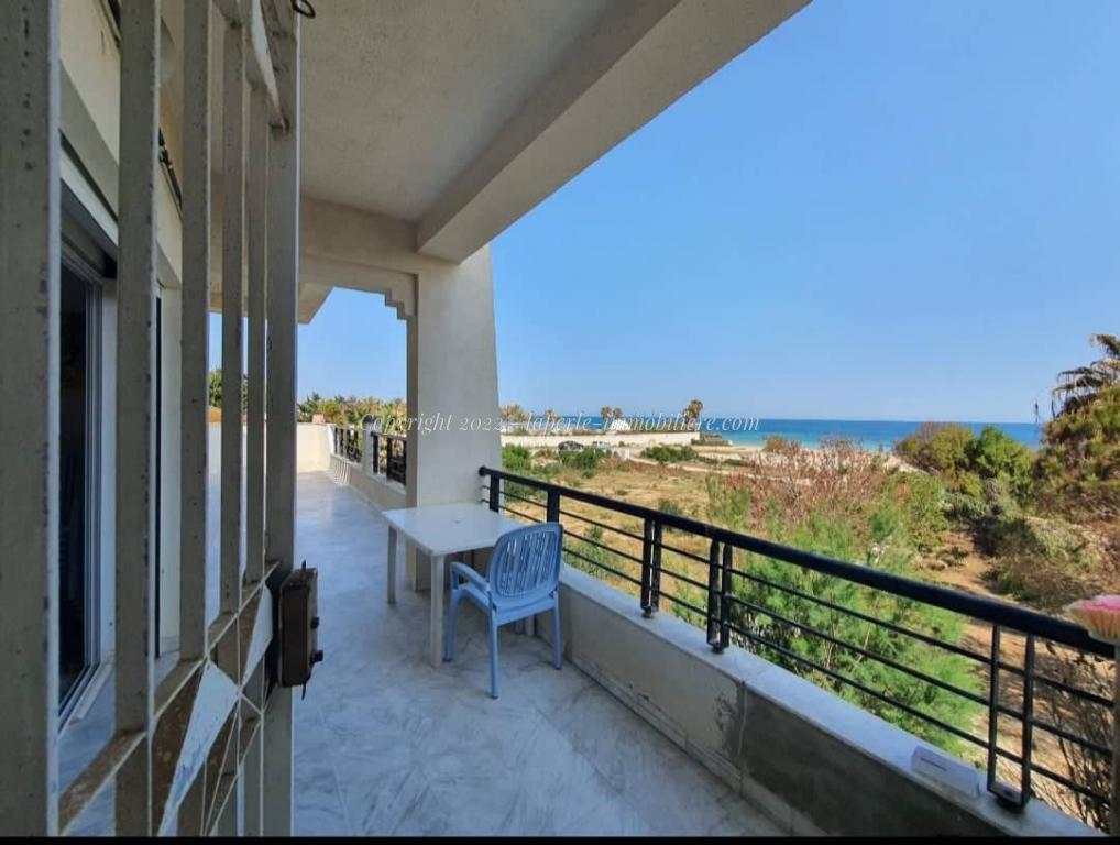 La villa construite sur deux niveaux : Le salon assez spacieux est partagé entre un coin salon et coin repas,L’ensemble ouvre sur la terrasse et le jardin offrant une vue mer panoramique,cuisine indépendante,et bien équipée elle ouvre sur l'extérieure,Une salle d'eau d'invités