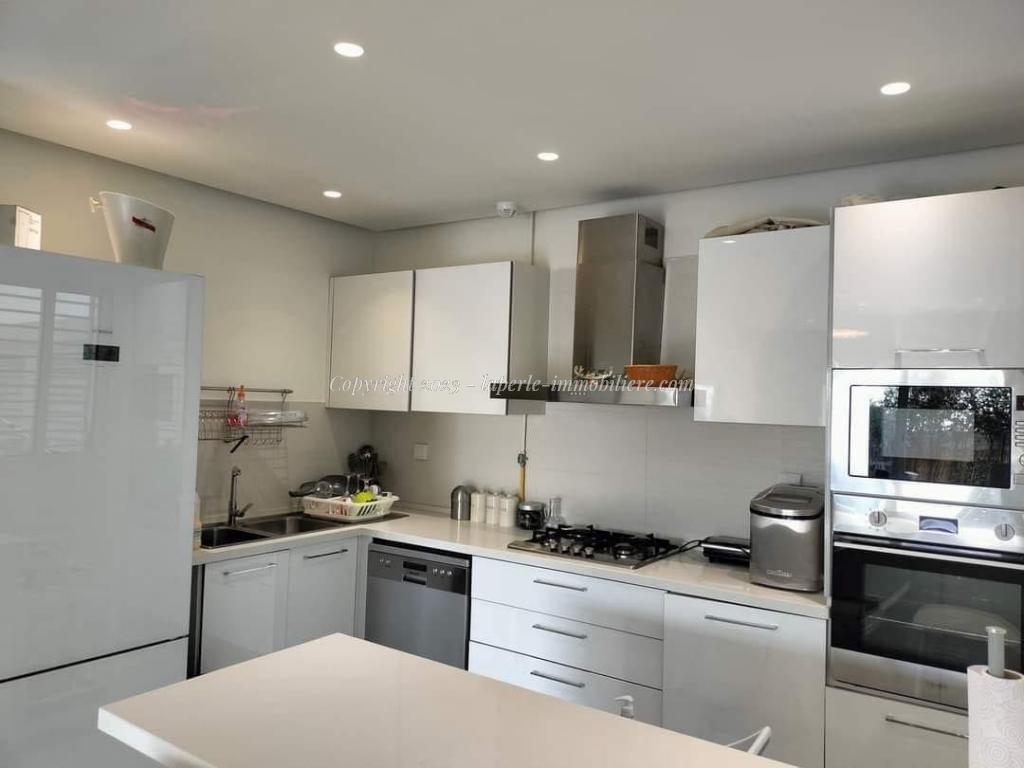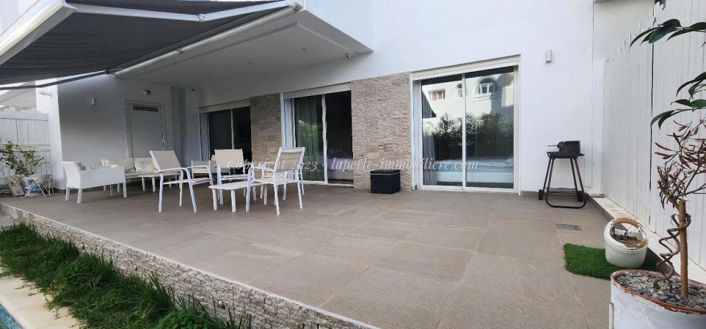 Grand salon ouverte sur le piscine et jardin, cuisine bien équipée et salle d'eau